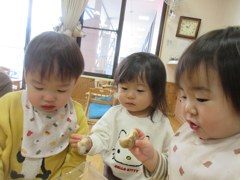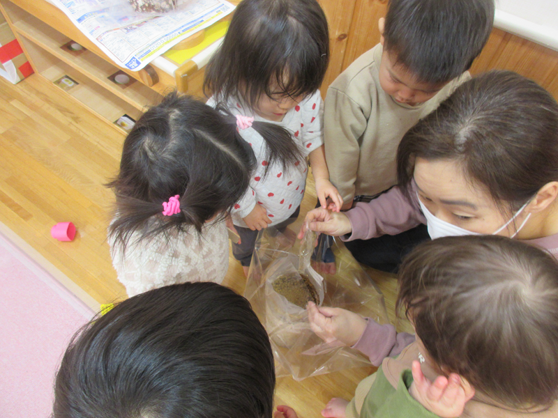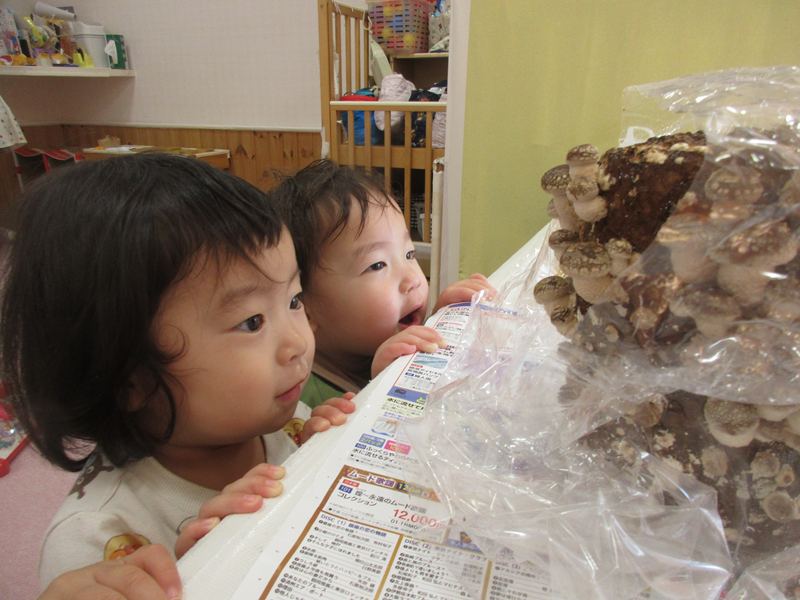 今ぶどうくみで、しいたけとぶなしめじを育てています!先生と一緒にシュッシュとお水をあげてお世話をし、少しずつ大きくなるのを毎日観察しています。ぷくっと食べごろになったきのこを、みんなで収穫し、給食の先生にお願いしてお味噌汁に入れてもらいました。おかわりをしてたくさん食べました!おいしかったね!