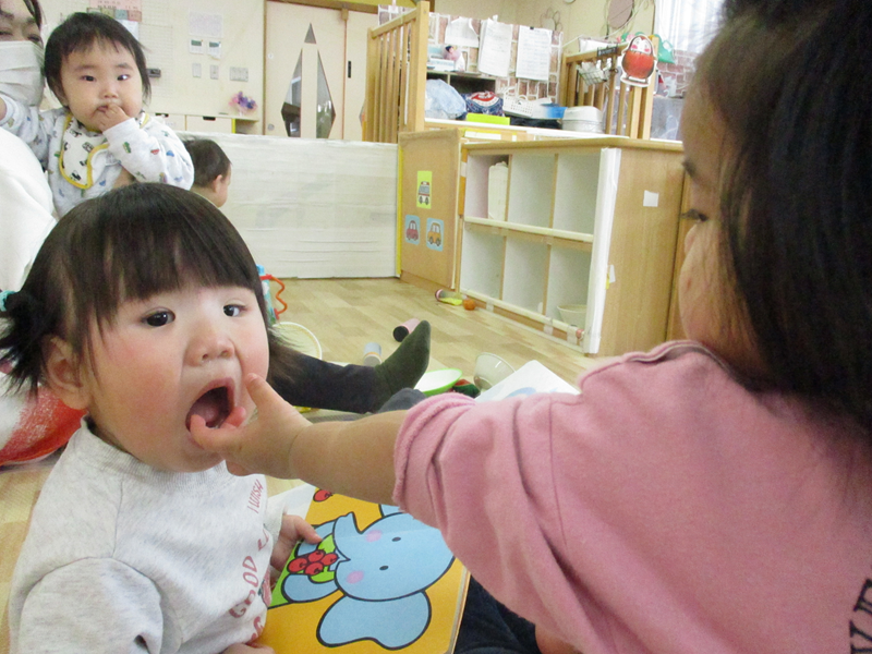 絵本に出てくる言葉や表情を真似してみたり、友だちや保育者と笑い合ったり。また泣いている場面が出てくると、なでなでしてくれる優しい姿も見られます!