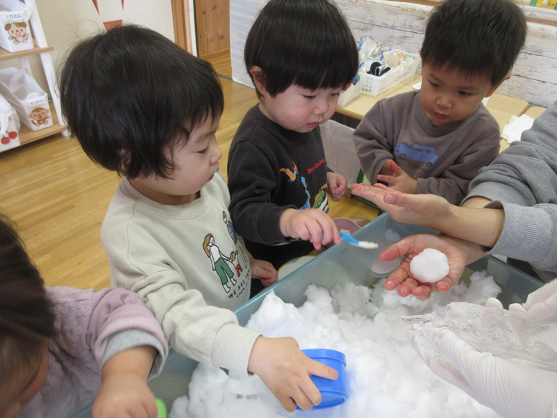 あったかい部屋の中に雪を持ってきて、雪あそびが始まりました。そっと手を伸ばして雪に触れ「つめたーい!」の声。だんだん慣れてくると、ぎゅっと握ったり、カップにつめてかき氷やさんになったり…。また別の日には、園庭でも雪あそび。お友だちと一緒におなべに雪をいっぱい入れて「ごはんだよ」「はいどうぞ」とお料理をしていました。