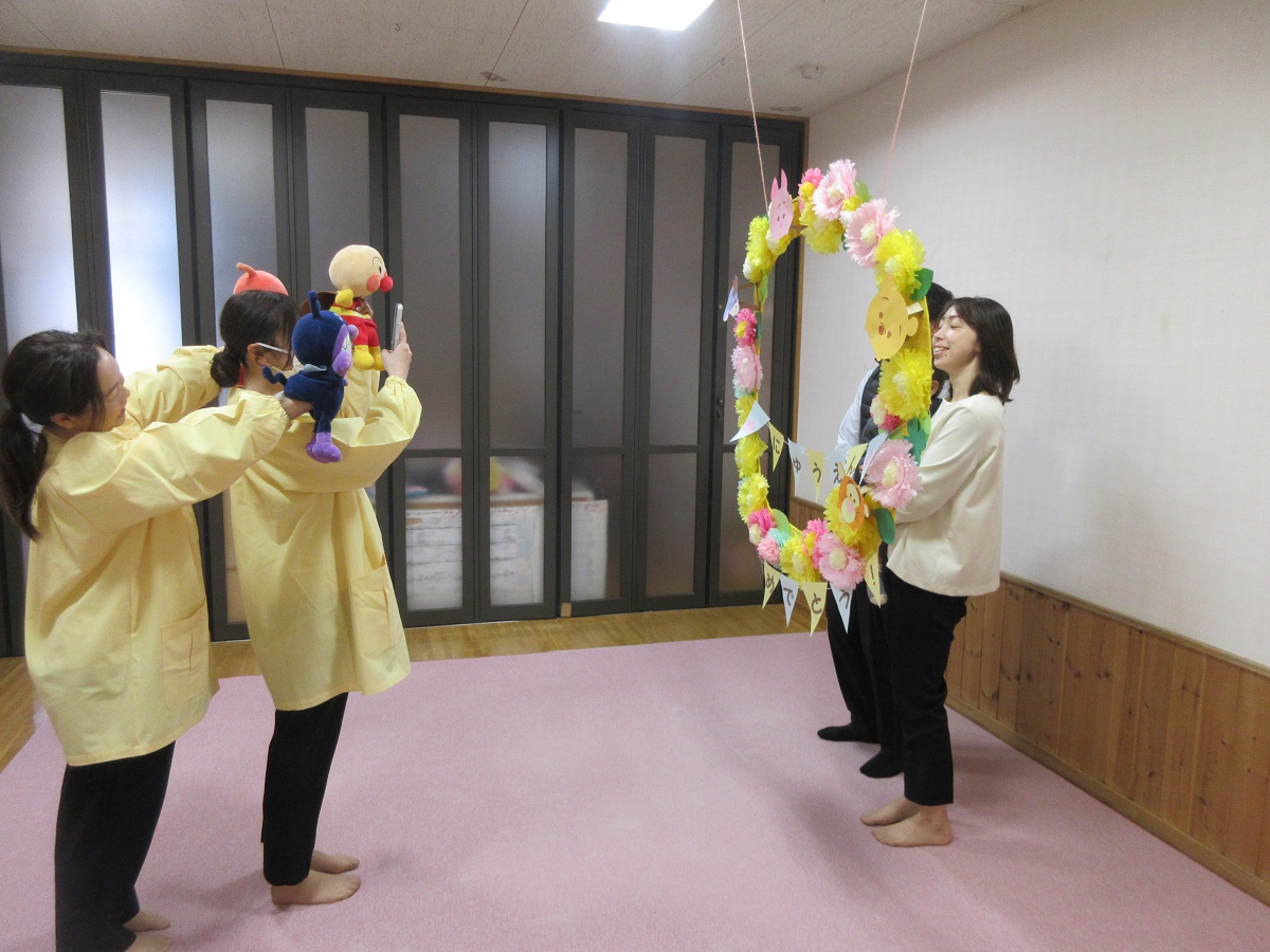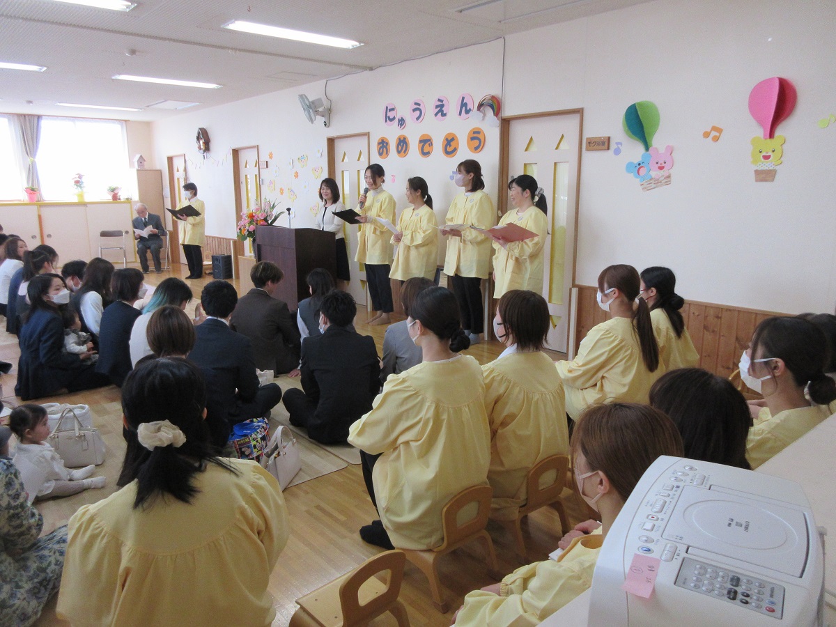 乳児施設ということもあり短い時間ではありましたが、歓迎の出しものとして「おもちゃのチャチャチャ」のペープサートを見ていただいたり笑顔いっぱいの楽しい入園式となりました。