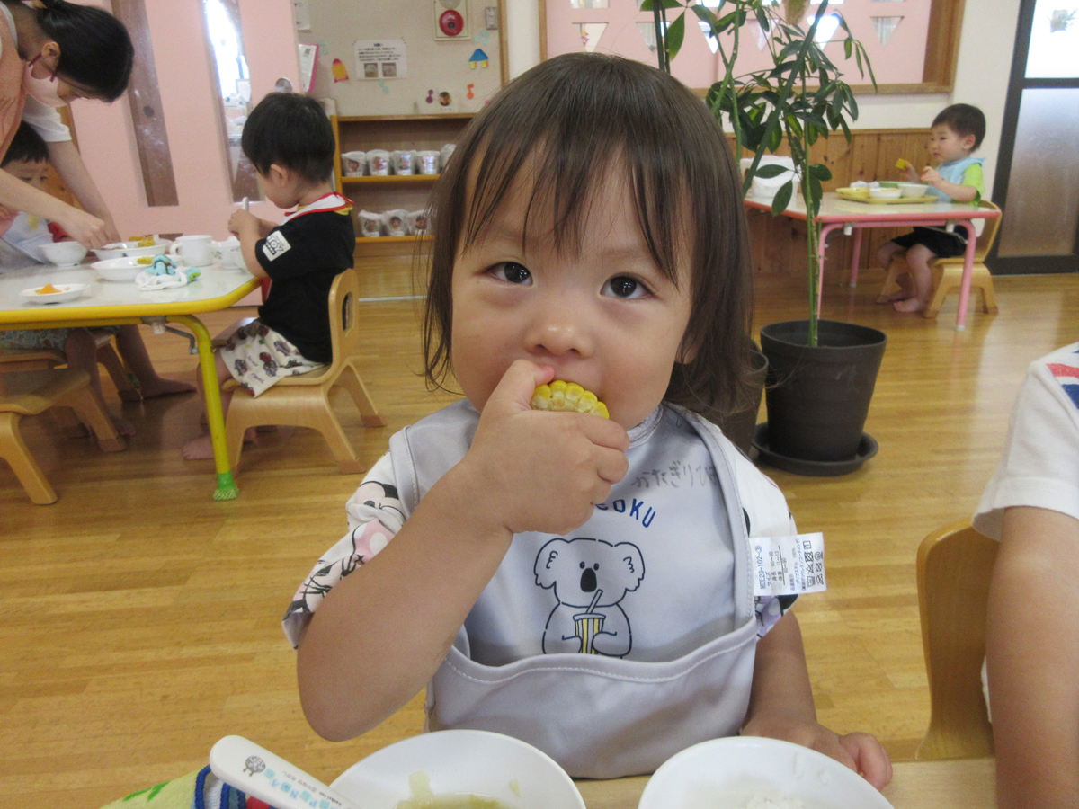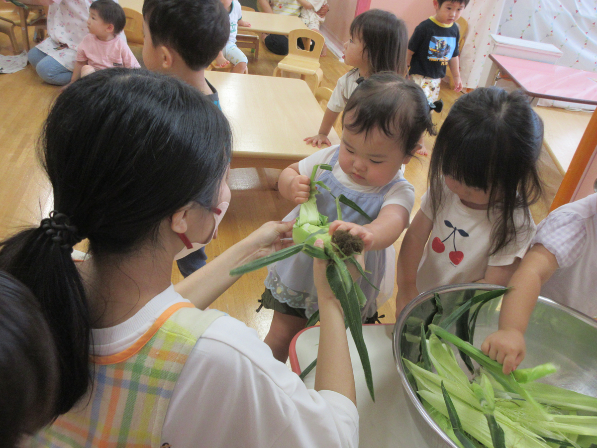 とうもろこしの皮むきに挑戦しました!最初はなかなか触れなかったお友だちも、とうもろこしを触っているお友だちの姿を見て、少しずつ"やってみたい!”と興味が湧く姿が見られました^^「お洋服みたいだね」「おひげついてるね」などと、子どもたちのたくさんの発見があり、1枚ずつ夢中になって皮をむいたり、おひげを触ってふわふわの感触を感じたりと、とうもろこしの皮むきを楽しみました♪みんなでむいたとうもろこしは、給食先生に調理していただき、給食で美味しく食べました!