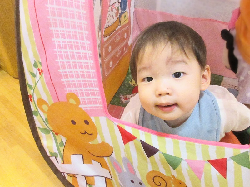 テントの小窓やスズランテープのカーテンから「ばあ!」とかわいいお顔をみせてくれます!お友だちと向き合って見せ合いっこをして笑い合う姿もあり、とっても可愛いです!