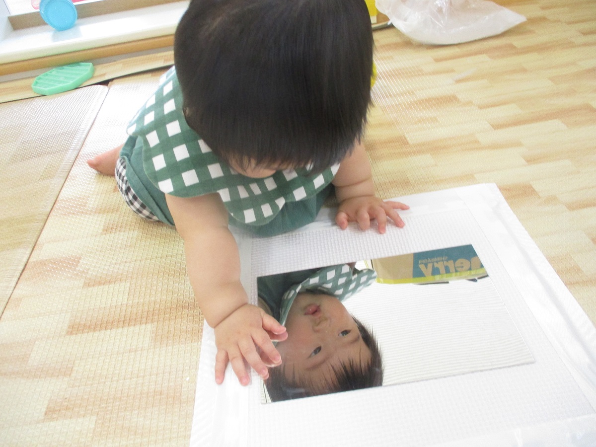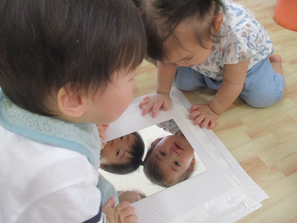 ミラーシートを壁や床に貼ってあげると『なんだろう?』とのぞきこんでいたおともだち。身の回りにあるすべてに興味津々。『あれ?ここにいる子はだあれ?』と不思議そうにじっと見ていた姿を大事にしながら一緒に楽しんでいます。